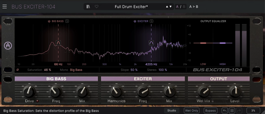 It has a stereo enhancer, which can operate in either mono or stereo mode. You can use the stereo enhancer in mono mode to enhance the bass response of a mix. In stereo mode, the left and right channels are processed separately to produce a wide, three-dimensional sound that enhances the sense of space.