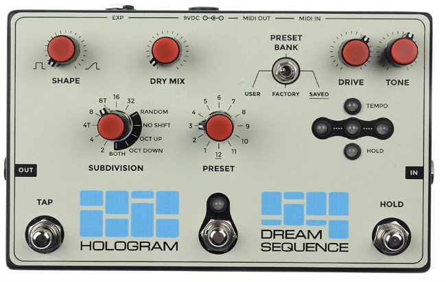 The Subdivision rotary switch allows you to choose a musical subdivision out of numerous choices. The Preset rotary switch and the Preset Bank switch allow you to scroll and select one of the Dream Sequence’s 35 internal presets. Near the base of the front panel, you’ll find three footswitches for Tap, Bypass, and Hold.